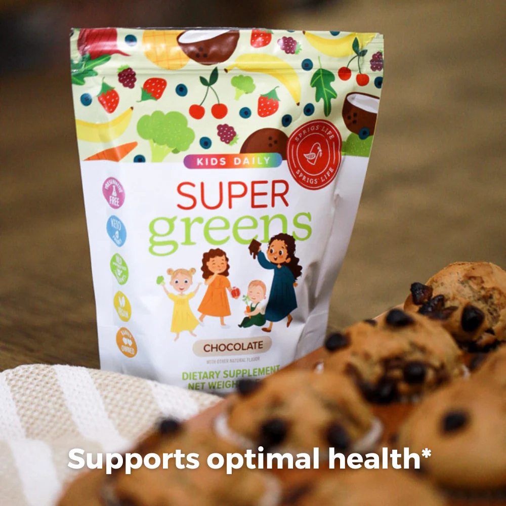 Packed with 48 superfoods, probiotics, fiber, trace minerals and more, Kids Daily Super Greens nourishes your child’s growing body and supports optimal health with a delicious, chocolatey taste your child will love.