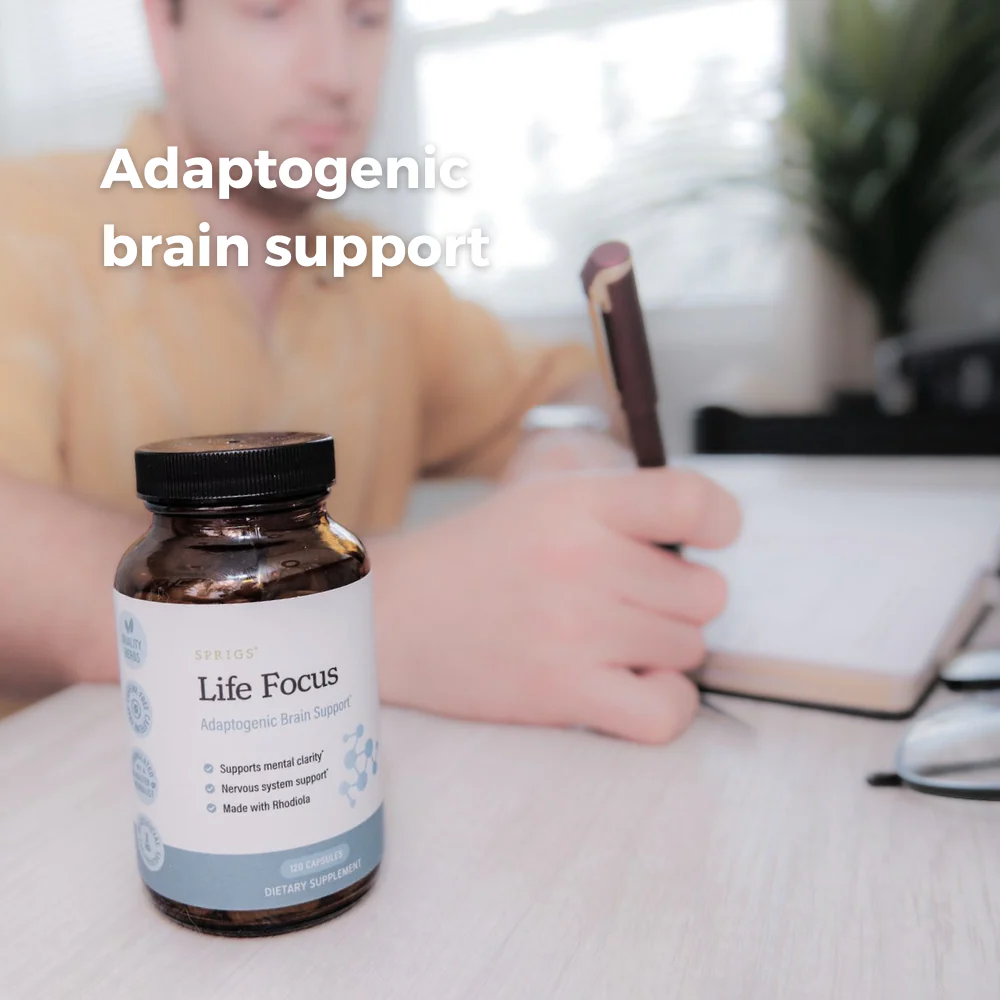 Life Focus is an adaptogenic brain support for mental clarity and calm focus without the caffeine crash. With a unique blend of herbs like Holy Basil, organic Gotu Kola, organic Rhodiola, and organic Schisandra, this non-stimulating formula offers gentle support to help you stay focused, grounded, and clear-headed through your busiest days. Whether you're navigating the demands of parenthood, juggling a full plate at work, or simply looking for a natural way to support your nervous system, Life Focus works with your body, not against it.