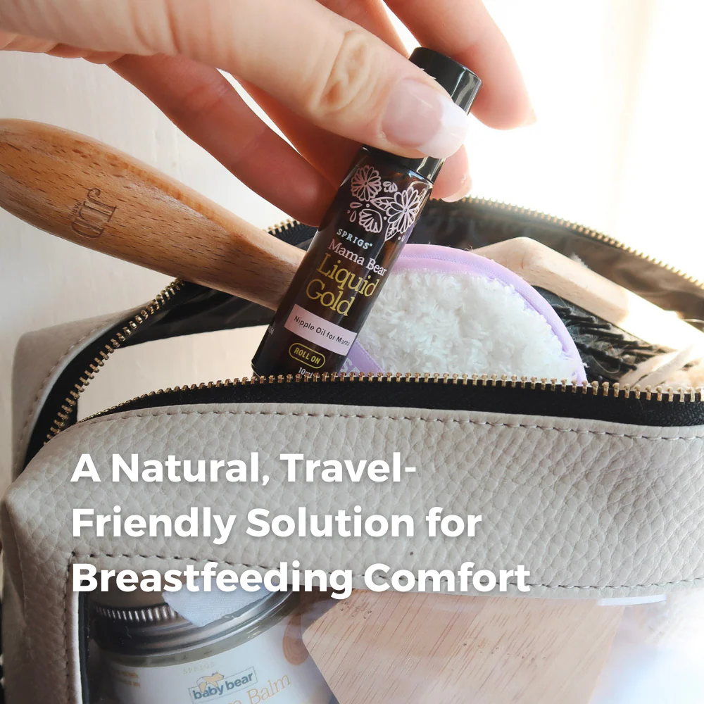 Liquid Gold is a breastfeeding essential for every mama! Made with Organic Calendula that gives your skin the TLC it deserves, while Frankincense, Lavender, and Peppermint Essential oils provide a comforting sensation. Its elegant rose scent, derived from rose essential oil, enhances your experience without any harsh chemicals or artificial fragrances. The unique blend comes in a mess-free roller bottle for effortless and discreet application. The lightweight formula absorbs quickly, leaving no greasy residue making this perfect for busy mamas seeking comfort and convenience. After each nursing session, simply roll on Liquid Gold and allow it to dry before the next feeding.