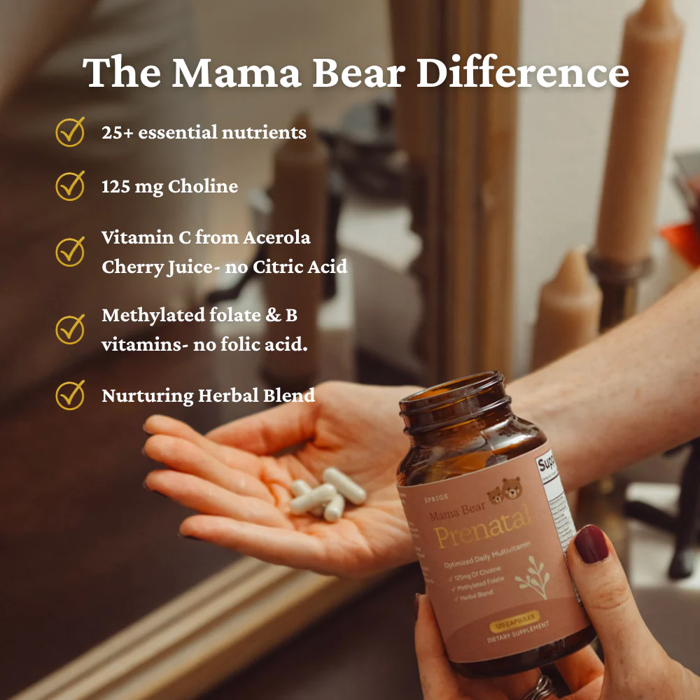 Mama Bear Prenatal provides 25+ essential nutrients including activated methylated folate and B -12, along with 125 mg of choline, and time-honored herbs in our nurturing prenatal blend. No fillers, no junk—just supportive nourishment for mama and baby before, during, and after pregnancy. Feel the Mama Bear Difference with quality forms of each nutrient.
